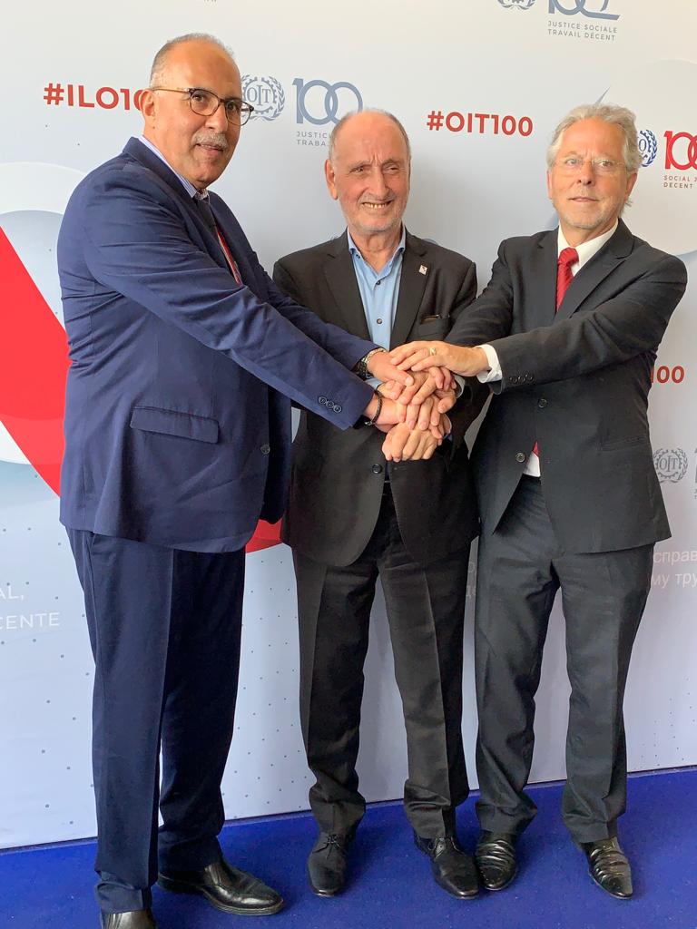 Una foto emblemática del trío fundador de la UMM: Abdelmoula Abdelmoumni, Vicepresidente por África de la UMM y Presidente de la Unión Africana de Mutualismo (UAM); Alfredo Sigliano, Presidente de la UMM y de ODEMA; y Luis Alberto Silva, Vicepresidente por Europa de la UMM y Presidente de la União das Mutualidades Portuguesas (UMP).