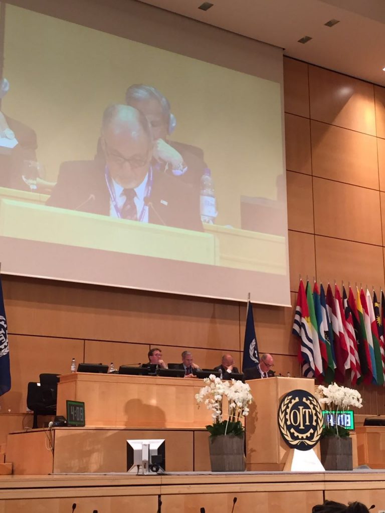 Alfredo Sigliano exponiendo en el Acto Central de la 105º Conferencia de la OIT, ante más de 187 Estados, en 2016.