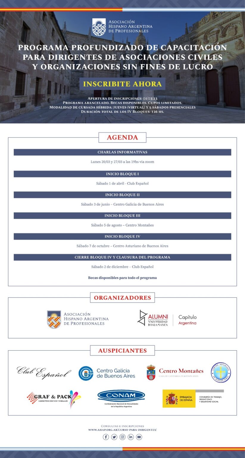 La Asociación Hispano Argentina de Profesionales (AHAP) y el Proyecto ALUMNI de la Universidad de Salamanca lanzan el Programa Profundizado de Capacitación para Dirigentes de Asociaciones Civiles y Organizaciones Sin Fines de Lucro destinado a miembros de órganos de gobierno, Gerentes Generales y asesores profesionales de este tipo de organizaciones que busquen potenciar sus conocimientos de management y asesoría. Asimismo, CONAM será uno de los auspiciantes del Programa.