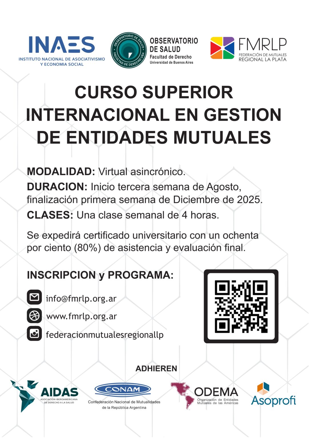 Sumate al nuevo “Curso Superior Internacional en Gestión de Mutuales” que organiza la Federación de Mutuales Regional La Plata (FMRLP), con la adhesión de CONAM, AIDAS, INAES, ODEMA y ASOPROFI, el cual busca reforzar la profesionalización del sector mutual en todo el país. Este programa, especialmente diseñado para dirigentes, empleados y fiscalizadores, será desarrollado enteramente virtual e iniciará en la tercera semana de agosto.