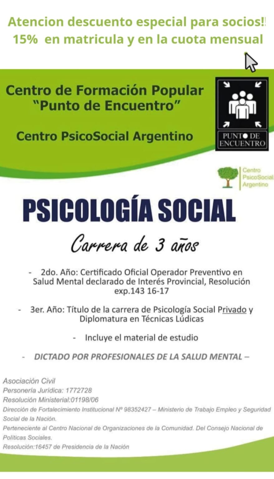 Punto de Encuentro abre, además, la posibilidad de establecer convenios con mutuales y organizaciones de la economía social, con el objetivo de acercar esta propuesta formativa a sus asociados. A través de estos acuerdos, las entidades podrán ofrecer la carrera de Psicología Social con importantes beneficios y descuentos, ampliando el acceso a la formación profesional y fortaleciendo el rol educativo del mutualismo como herramienta de inclusión, promoción social y desarrollo comunitario.