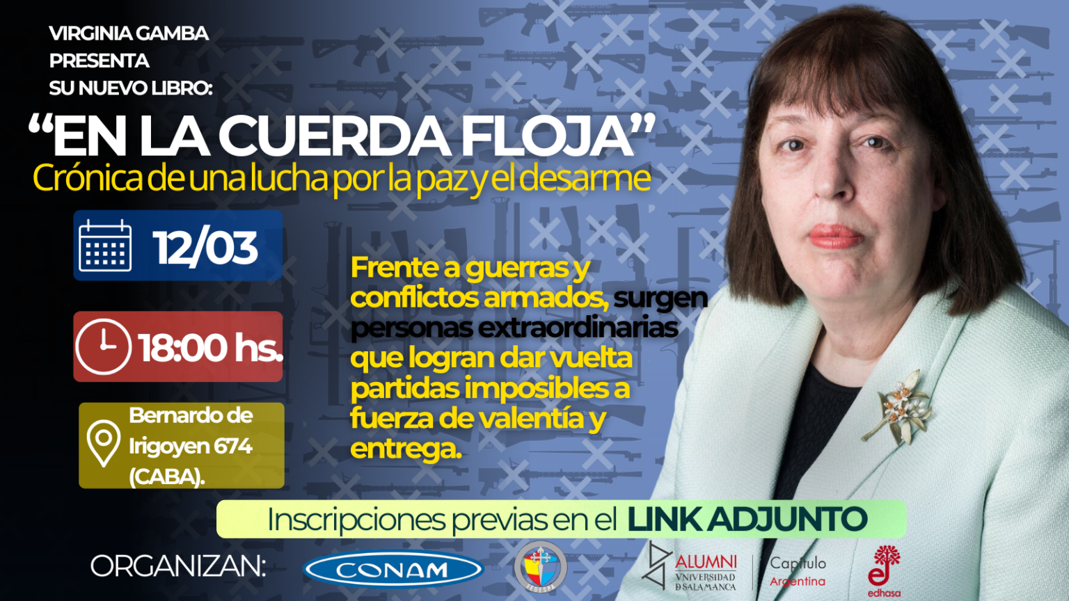 CONAM invita a participar de la presentación del nuevo libro de la Dra. Virginia Gamba, destacada diplomática argentina en la Organización de Naciones Unidas (ONU), titulado: “En la cuerda floja: Crónica de una lucha por la paz y el desarme”. El evento se realizará el próximo 12 de marzo a las 18:00 hs en la sede de la Federación de Sociedades Españolas de Argentina (FEDESPA), situada en Bernardo de Irigoyen 674 – CABA, en un acto abierto y gratuito para toda la comunidad. REQUIERE INSCRIPCIÓN PREVIA.